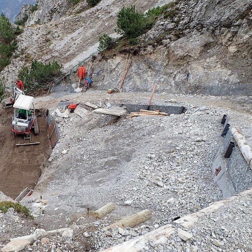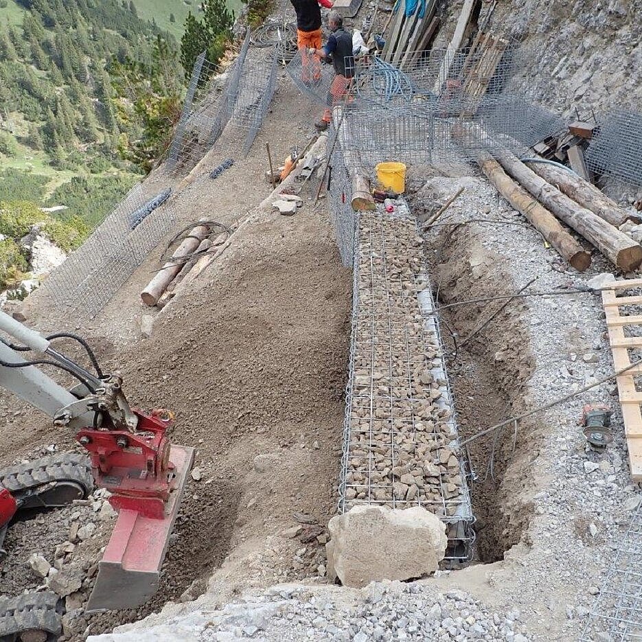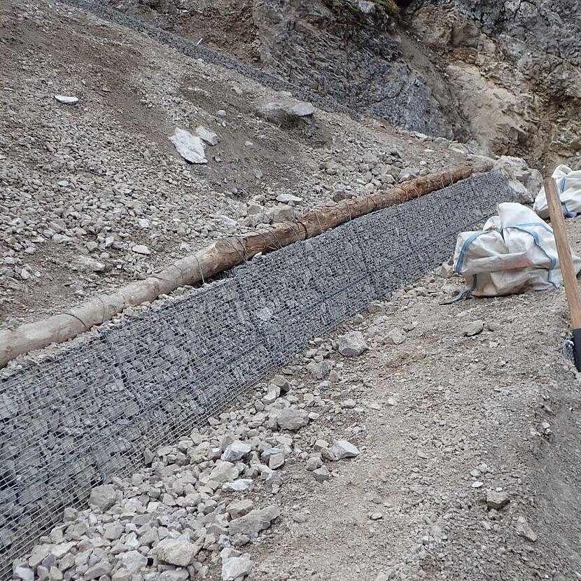 Ein Hangrutsch zerstörte den Wanderweg in Triesenberg FL. Für die Sanierung des Wanderweges in extrem steilem Gelände entschied sich der Bauherr für unsere Steinkörbe System Füco mit Spiralverschluss. Die Steinkörbe wurden zur Sicherheit zurückverankert.