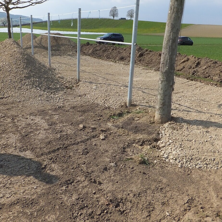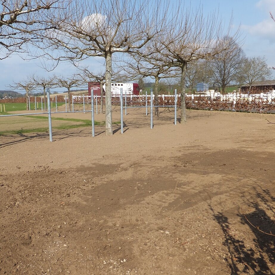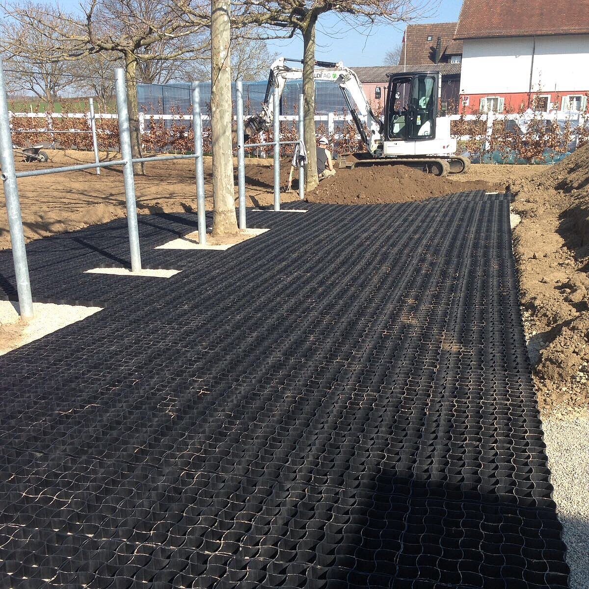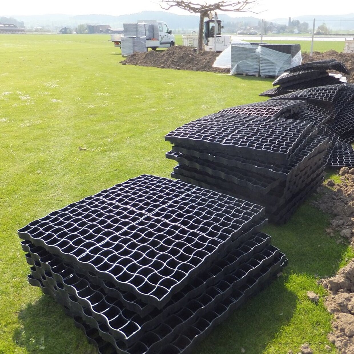 Im Polopark Seuzach wurde die Wartezone für Pferde, die auf ihre Einwechslung warten, mit unseren Runfloorplatten befestigt. Die Rasengitterplatten belegen die rund 1'000m2 grosse Wartezone und sorgen für eine gute Entwässerung, damit die Pferde auch bei nassem Boden trocken stehen und der Rasen nicht zu stark in Mitleidenschaft gezogen wird. Die Bilder zeigen die Einbaufolge und der fertige Platz wird schliesslich noch begrünt.