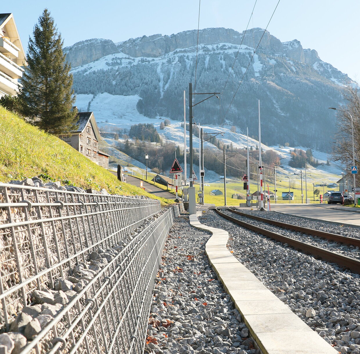 Das System Rüglei AZ Standard wird für die Bahntrasse-Entwässerung, für Bahnbankette, Strassenbankette und Böschungssicherungen verwendet. Die geschweissten Stahldrähte sind aluverzinkt